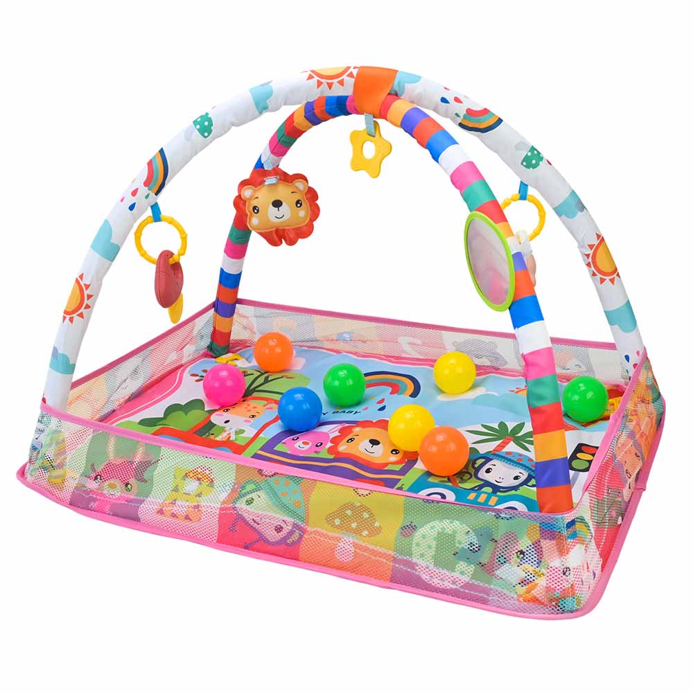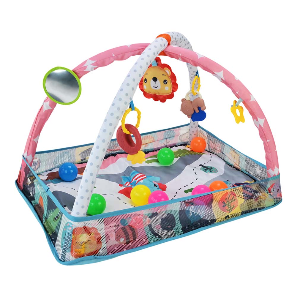 Різнокольоровий та комфортний килимок для малюків — ідеальне місце для гри та відпочинку. Це простора ігрова та розвиваюча зона для активних рухів малюка, яка допоможе у його перших кроках! Комплектація: Ігрова зона з бортиками та дугами; Брязкальця, що підвішуються над ігровою зоною; 8 кульок для гри. Особливості: Килимок має привабливий вигляд із зображенням різних