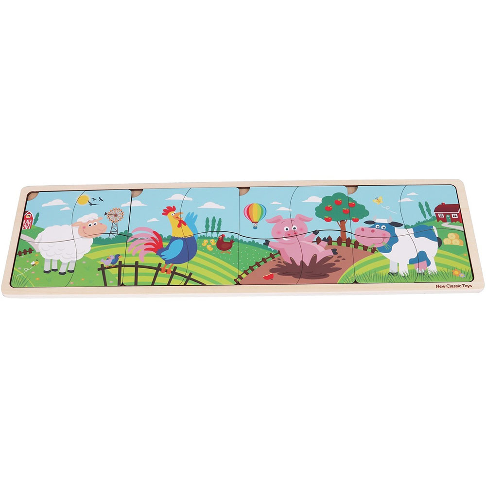 Пазл New classic toys Ферма допоможе дитині познайомитися з тваринами, які живуть на фермі. Пазл складається з 16-ти частин із зображенням свині, півня, корови та вівці. Поєднайте дерев'яні частини головоломки на дошці, щоб зібрати чотири головоломки з тваринами. Складання пазла стимулює розпізнавання форм, кольорів та зображень. Пазл виготовлений зі 100% сертифікованої деревини FSC. Розмір: 54 х 15 х 1 см. Гра з набором розвиває логіку, увагу, дрібну моторику, зорово-моторну координацію та творчі здібності вашої дитини. Рекомендовано для дітей віком від 2-х років.