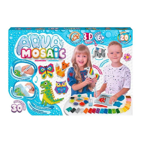 Аквамозаїка Aqua Mosaic DankoToys великий набір AM-01-01 - 30 схем, 20 кольорів бісеру, від 6 років