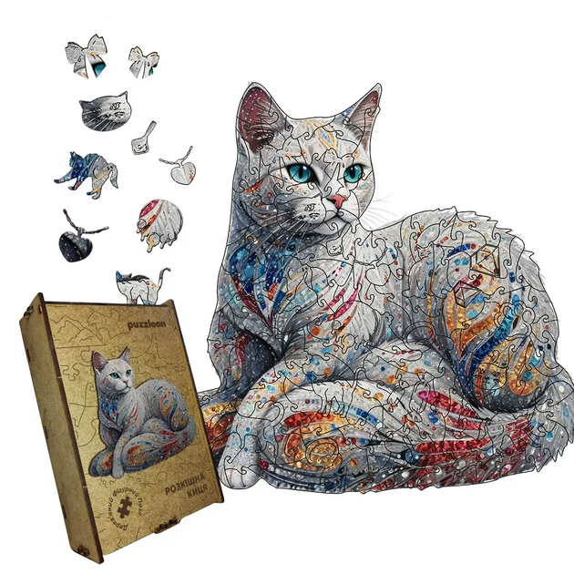 Пазл дерев'яний Розкішна Киця, А1, 500+ елементів, Дерев’яна коробка