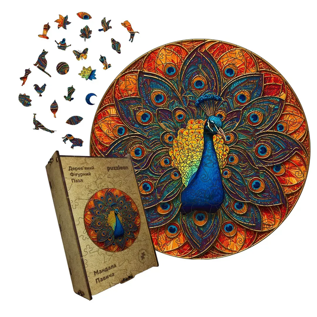 Дерев'яний фігурний пазл Мандала Павича, А1, Дерев'яна коробка 500+ елементів