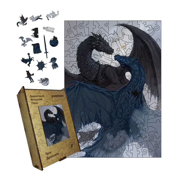 Дерев'яний фігурний пазл Тріо Драконів, А1, Дерев'яна коробка 500+ елементів