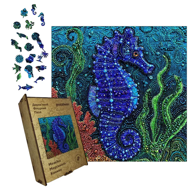 Дерев'яний фігурний пазл Мозаїка Морського Коника, А1, Дерев'яна коробка 500+ елементів