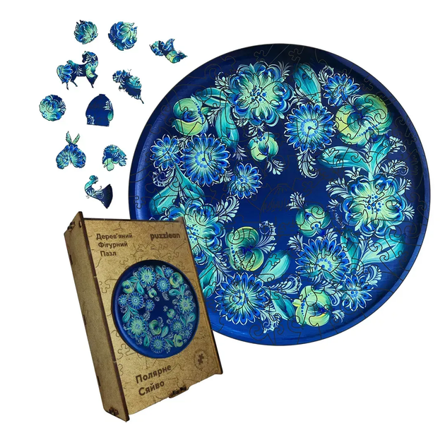 Дерев'яний фігурний пазл Петриківський Розпис Полярне Сяйво Катерини Каракуці, А1, Дерев'яна коробка 500+ елементів