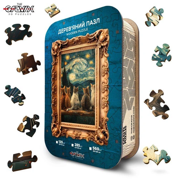 Дерев’яний Пазл The Gravix “Зоряна ніч та 5 котів”, розмір 580х380 мм, 560 деталей