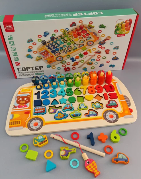 Дитячий сортер дерев'яна логічна дошка інтерактивна розвиваюча гра магнітна риболовля WToys Автобус
