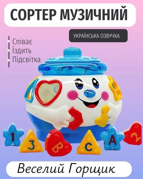 Дитячий сортер музичний з українською озвучкою, цифри та форми Чарівний горщик біло-блакитний