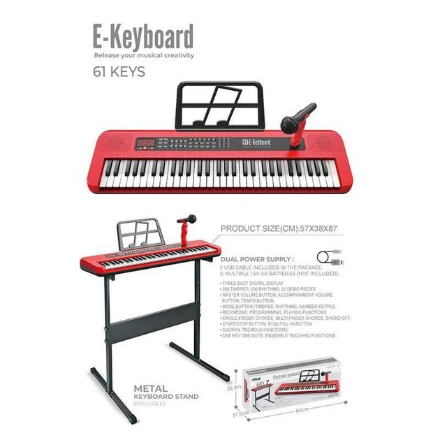 Синтезатор 328-75 (12) мікрофон, 61 клавіша, працює від мережі або батарейок, звук, підсвічування, 3 AUX-роз'єми, AUX-кабель