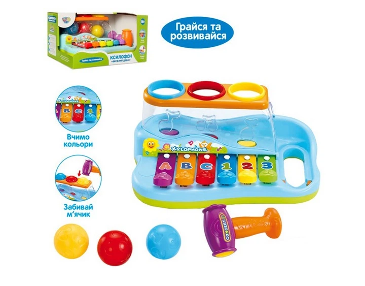 Ксилофон дитячий, ігровий центр, інтерактивна розвиваюча музична іграшка з молоточком і м'ячиками, Hola Toys, різнобарвна.