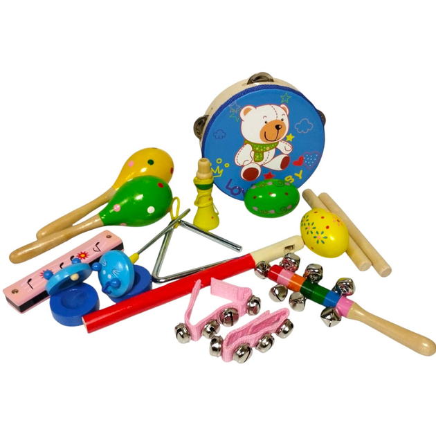Дитячий музичний набір інструментів у контейнері №4 (15 предметів) – маракаси, сопілка, гармошка, бубен