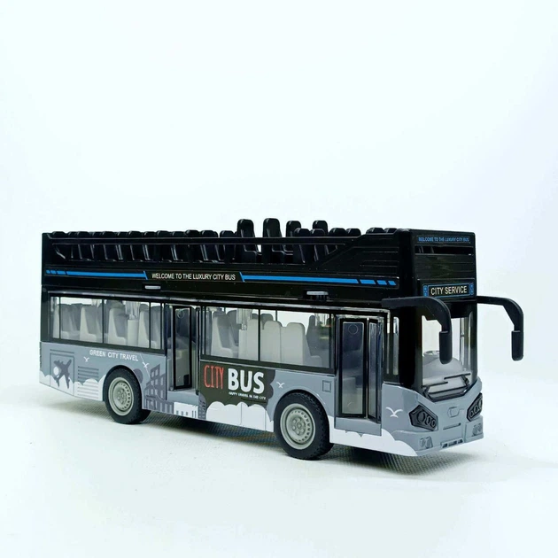 Іграшковий автобус двоповерховий Sity Bus 28 см сірий — інерційний міський транспорт зі світлом і звуком, арт. JS122-122A
