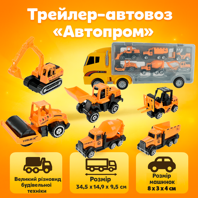 Трейлер-автовоз "Автопром" 34см з 6-ма машинками будівельної техніки, жовтий PS006-4