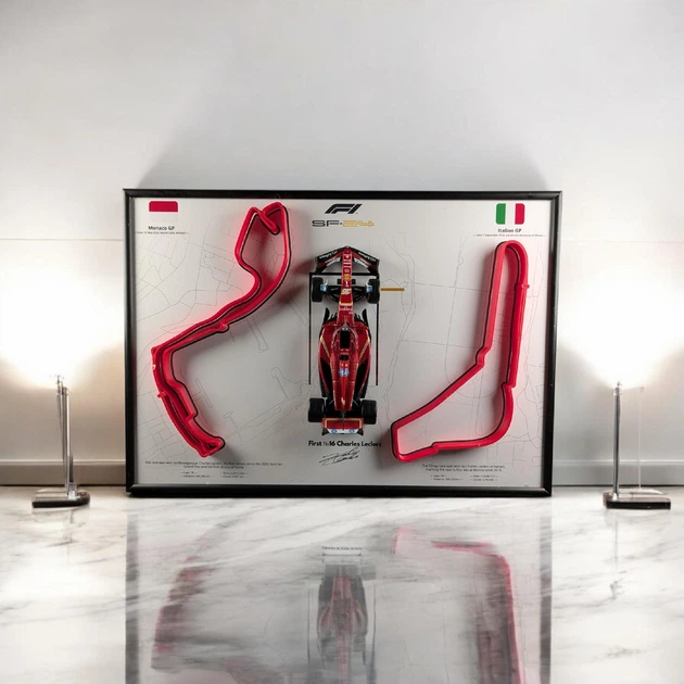 Модель Bburago з Рамкою Тримачем 2в1 на Стіну або Полку з F1 Ferrari SF24 та З Двома 3D Трасами на яких він переміг (Monaco