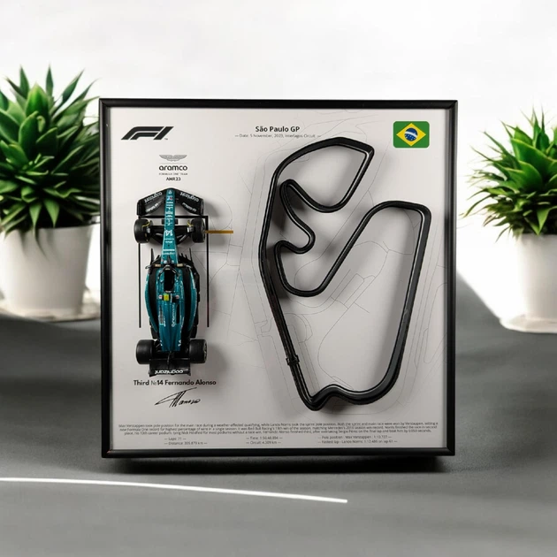 Колекційна Модель Bburago з Рамкою Тримачем 2в1 на Стіну або Полку з F1 Aston Martin Aramco (AMR23) і 3D Трасою So Paulo GP