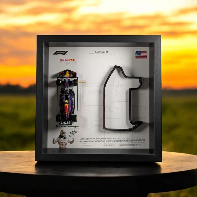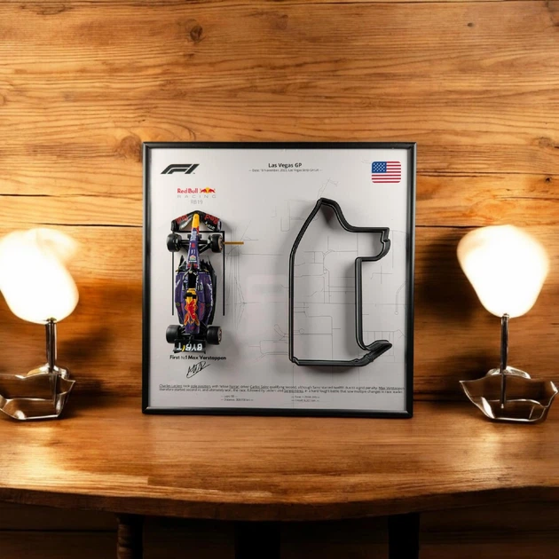 Модель Bburago з Рамкою Тримачем 2в1 на Стіну або Полку з Red Bull RACING RB19 та 3D Трасою Las Vegas Grand Prix / "Las Vega