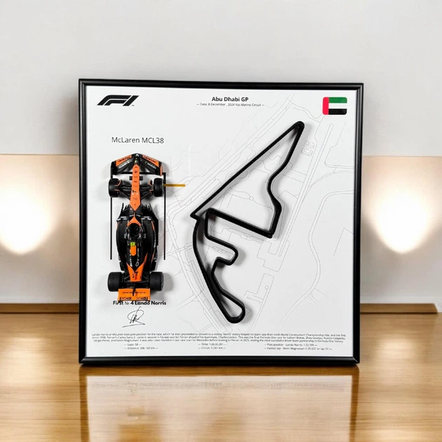 Колекційна Модель Bburago з Рамкою Тримачем 2в1 на Стіну або Полку з F1 McLaren MCL38 та 3D Трасою Abu Dhabi GP "Yas Marina