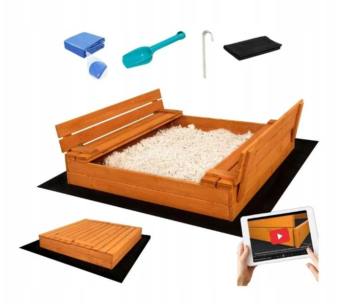 Дерев'яна просочена пісочниця SandTropic SB20i 120х120 см з розкладними лавками - кришкою, дном та брезентом