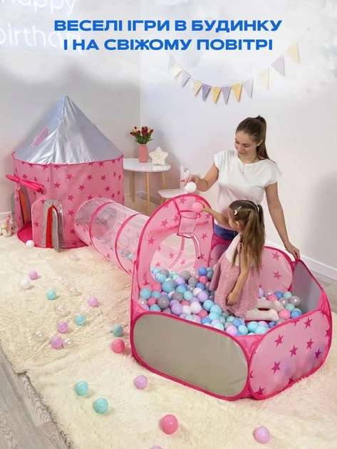 Ігровий дитячий намет 3 в 1 намет, тунель та сухий басейн для м'ячів (рожевий)