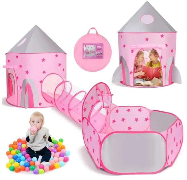 Дитячий намет 3 в 1 (намет, тунель та сухий басейн для м'ячів) зіркове небо Ракета рожева для відпочинку, для пляжу, для дач