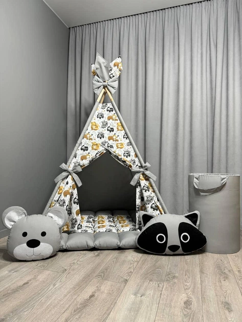 Вігвам Звірята на сірому 7 з матрасиком БОНБОН та кошиком для іграшок Повний комплект 0824