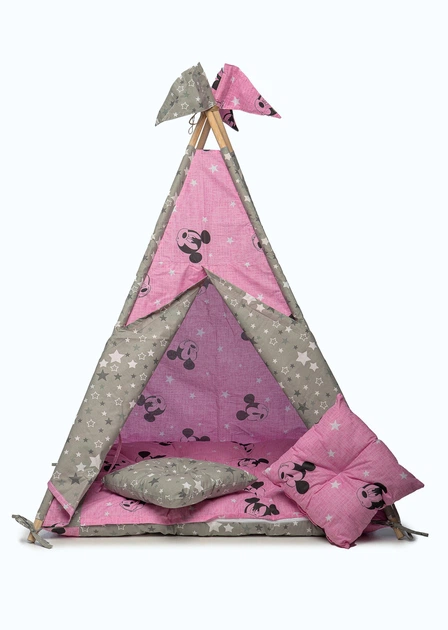 Вігвам намет дитячий для дітей з бавовни Панди рожеві з сірим з матрацом та подушками