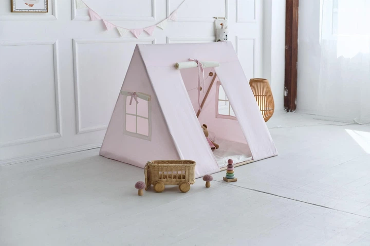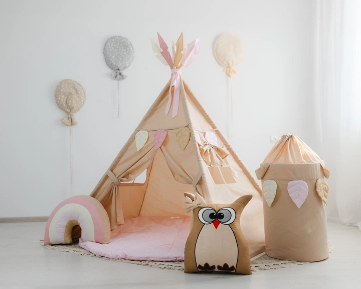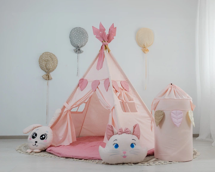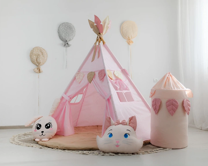 Вігвам намет для дітей Пухнасті друзі Пудровий з подушками іграшками + кошик для іграшок