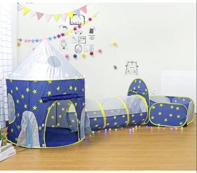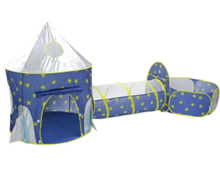 Дитячий намет 3 в 1 (намет, тунель та сухий басейн для м'ячів) зіркове небо Ракета синя для відпочинку, для пляжу, для дачі,