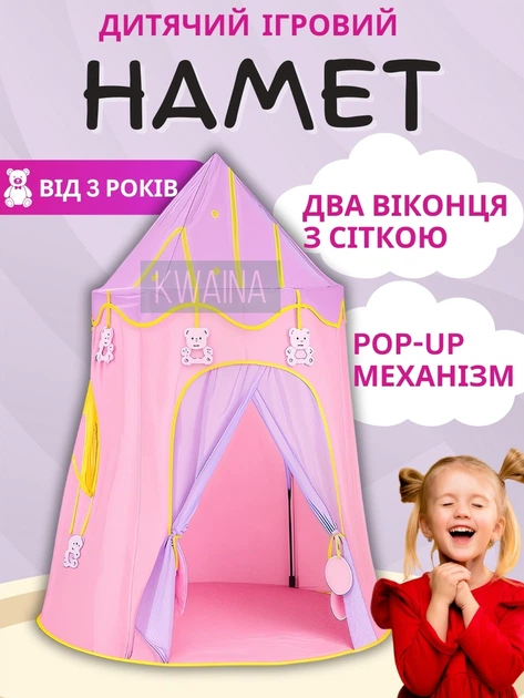 Дитячий ігровий намет Замок з віконцями, каркасний намет-будиночок для ігор та відпочинку вдома та на вулиці, Рожевий