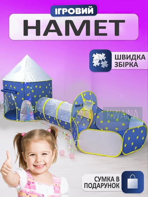 Ігровий комплекс для дітей ракета з тунелем та сухим басейном, космічний намет з баскетбольним кільцем, синій
