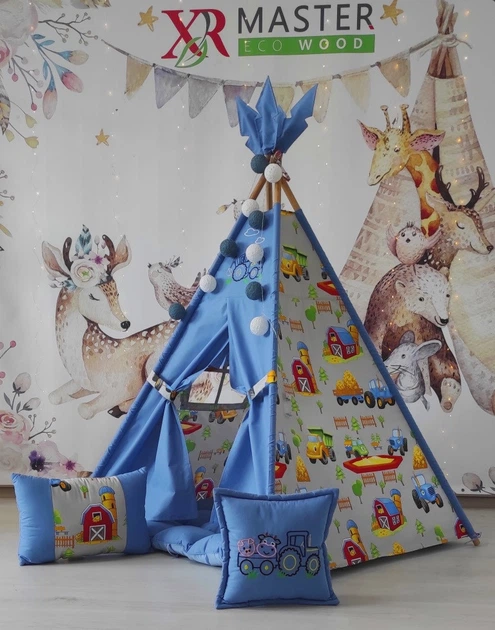 Вігвам для хлопчика Синій трактор з матрацом Бон Бон 115 см*115 см, 2 подушки, прапорці, бант та сумка для зберігання з текс