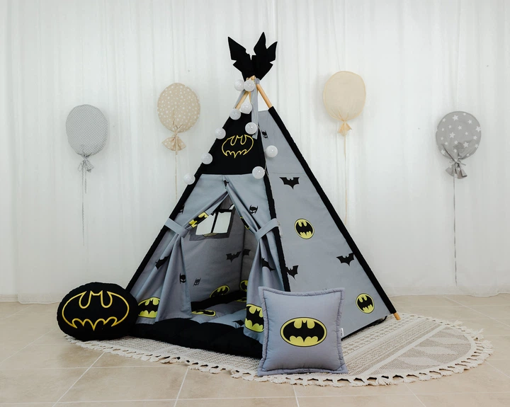 Вігвам для хлопчика сірий Бетмен супергерой з матрацом БонБон 115х115 см, подушками та сумкою для зберігання текстиль