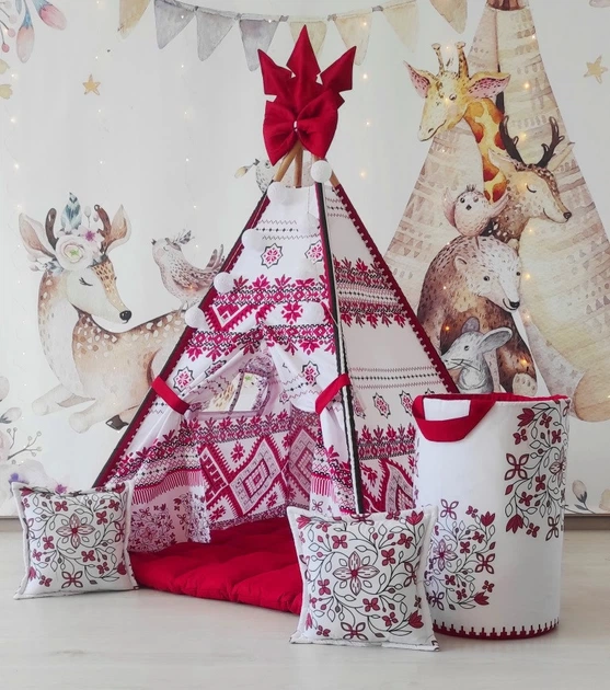 Вигвам намет для дітей Вишиванка матрац БОН БОН 115*115 см, 2 подушки, кошик, прапорці та сумка для зберігання з текстилю