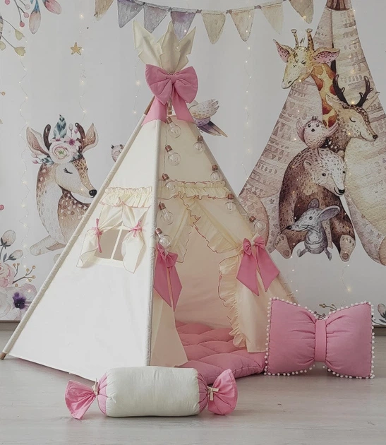 Дитячий Вігвам Lolly pop БОН БОН матрац 115 см*115 см, 2 подушки, бант, прапорці та сумка для зберігання з текстилю в кімнат
