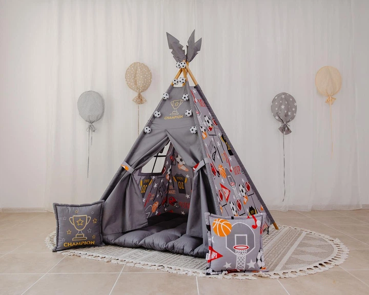 Вігвам сірий для хлопчика Чемпіон з матрацом Бон Бон 115 см*115 см, 2 подушки, прапорці та сумка для зберігання з текстилю