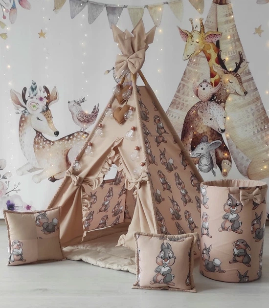 Вігвам для дитини Зайчики з матрацом 115х115 см, 2 подушками, прапорцями, підвіскою, кошиком та сумкою для зберігання тексти