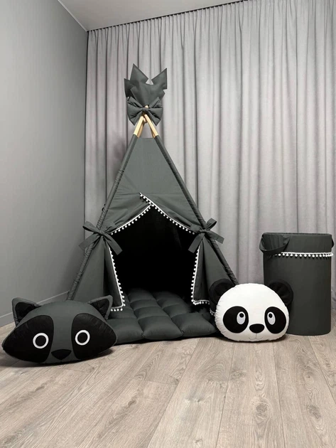Вігвам Графіт з матрасиком БОНБОН подушками панда та єнотик і кошиком для іграшок Повний комплект 0926