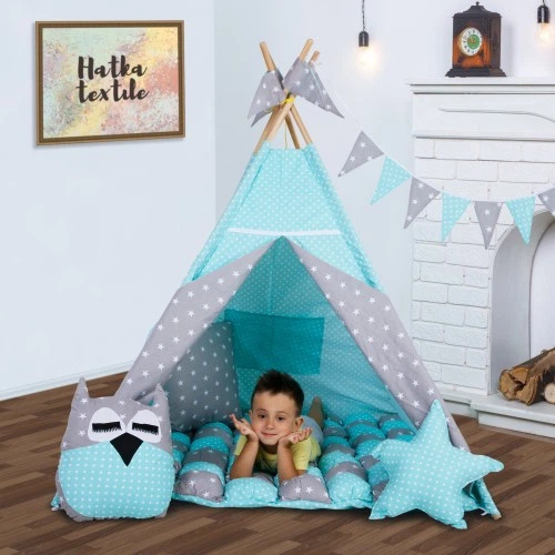 Вігвам Хатка комплект бонбон Зірки М'ятний із сірим з подушками - Великий