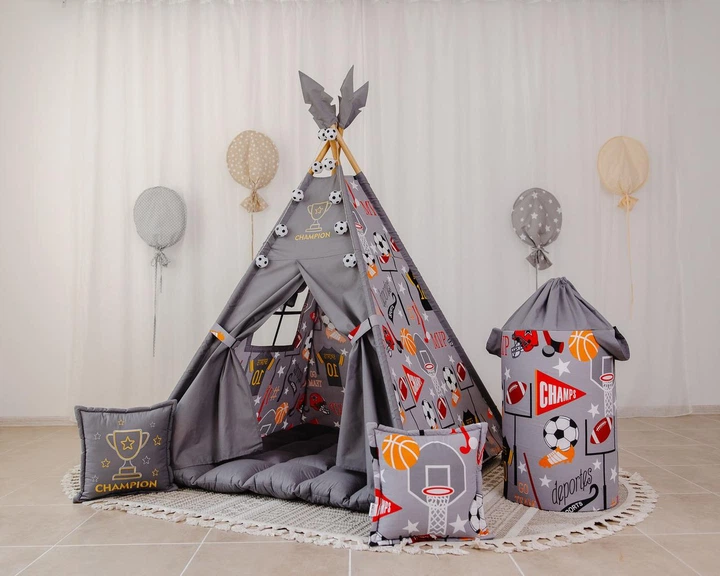 Вігвам сірий для хлопчика Чемпіон з матрацом Бон Бон 115 см*115 см, подушкам, кошиком для іграшок та сумкою для зберігання з