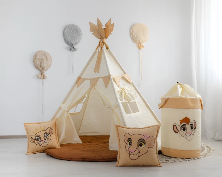 Вігвам для дітей Король Лев з матрацом 150 см, подушками, кошиком для іграшок та сумкою для зберігання з текстилю