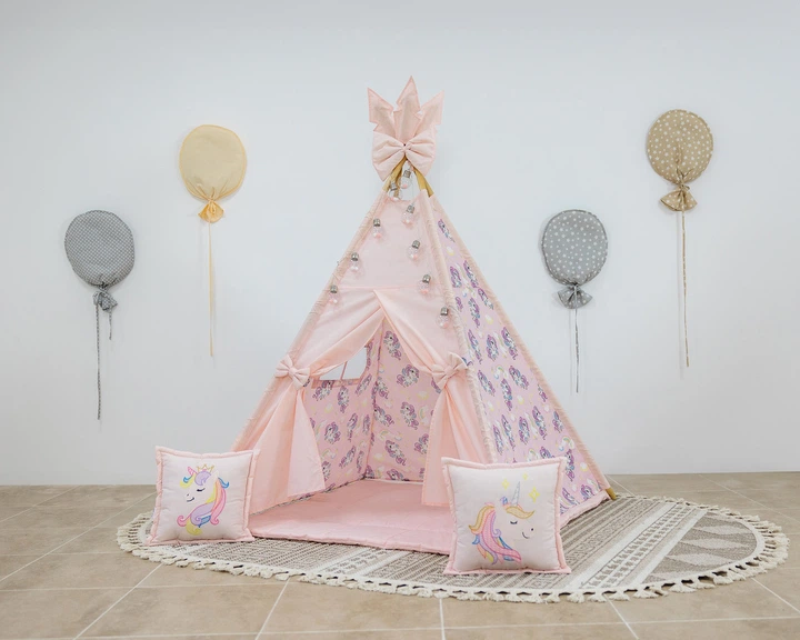 Вігвам з єдинорогами Unicorn з матрацом 115*115 см, 2 подушками, прапорцями, бантом, фіксатором та сумкою для зберігання з т