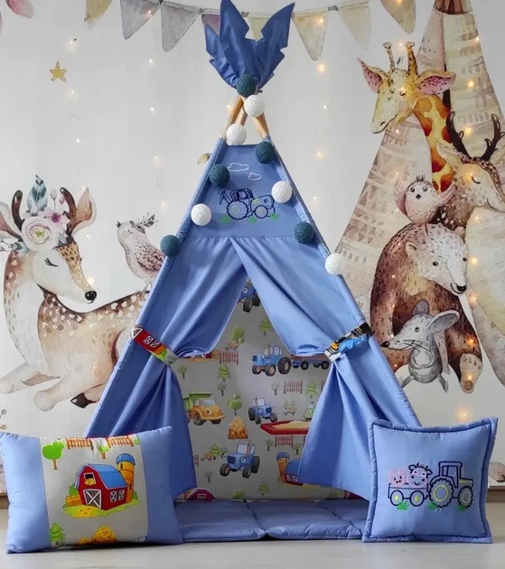 Вігвам дитячий будиночок намет для хлопчика Синій Трактор, машинки з подушками