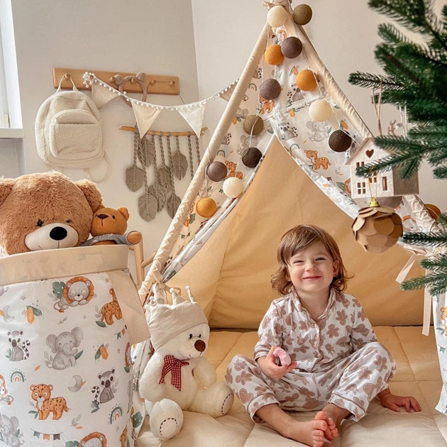 Вігвам-намет Viksi Piksi "Слони та леопарди бежевий" | Дитячий комплект із килимком та подушкою | 100 бавовна, дерев'яний ка