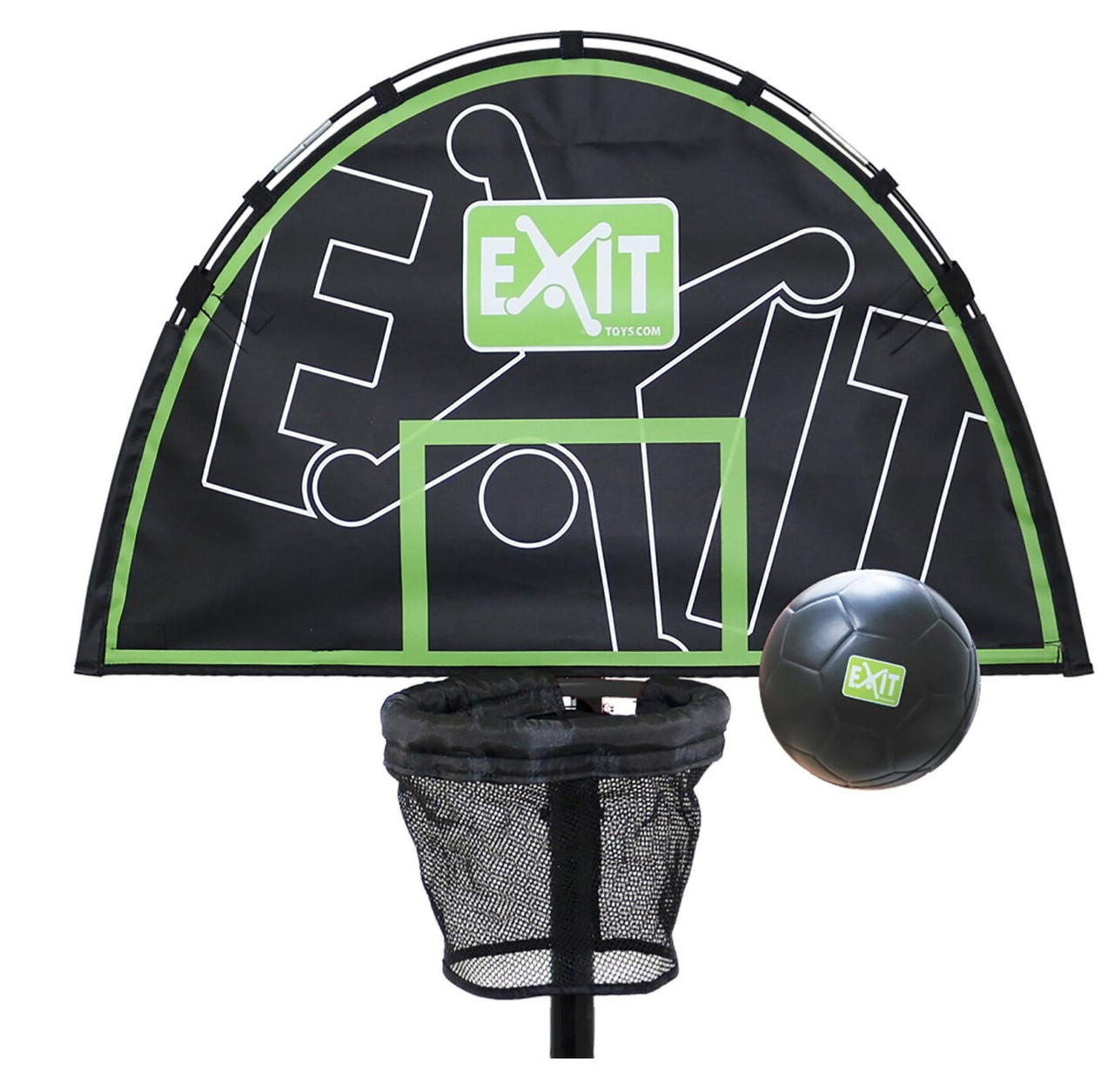 Барвистий чорно зелений Баскетбольний щит для батутів EXIT робить стрибки на батуті ще більше захоплюючими. Кошик для батута легко встановлюється на одну з опор захисних сіток діаметром від 25 до 38 міліметрів. Поставляється з м'яким м'ячиком з пінопласту. Практикуйте найкрутіші рухи і точні кидки з батутной баскетбольним кошиком EXIT! Комплектація: Баскетбольний кошик для батутів