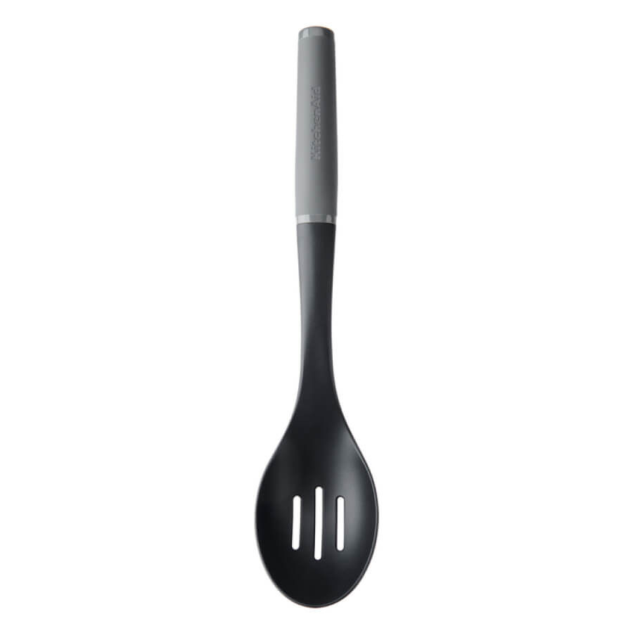 Ложка для сервіровки з прорізами KitchenAid Coreline, 34 см (KAS004OHCGG) Ложка з прорізами KitchenAid – ідеальний інструмент для піднімання та висипання продуктів. Завдяки великій нейлоновій головці, вона безпечна для посуду з антипригарним покриттям і термостійка до 232°C. Ергономічна ручка з рельєфним логотипом забезпечує комфортне використання, а після приготування ложку можна легко очистити в