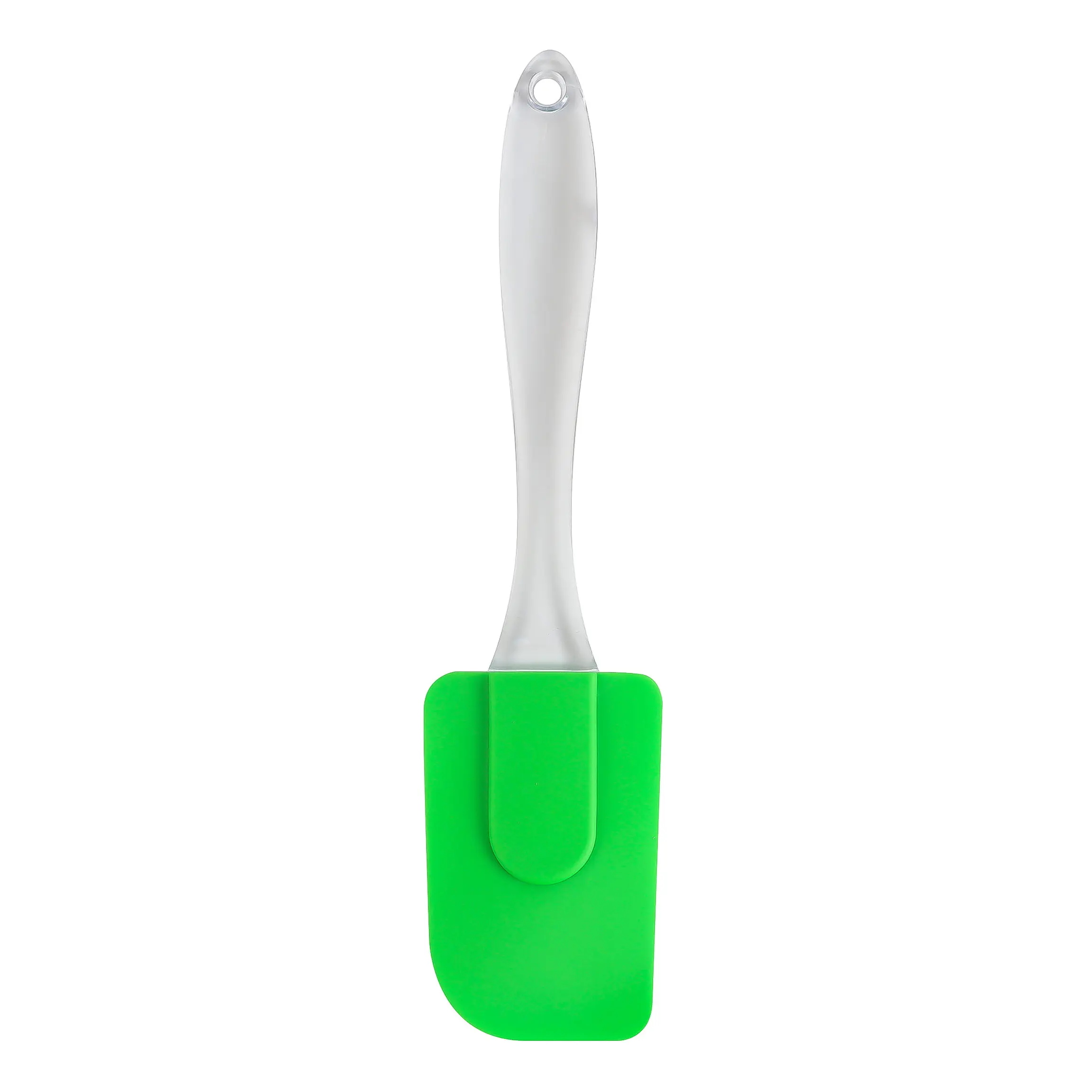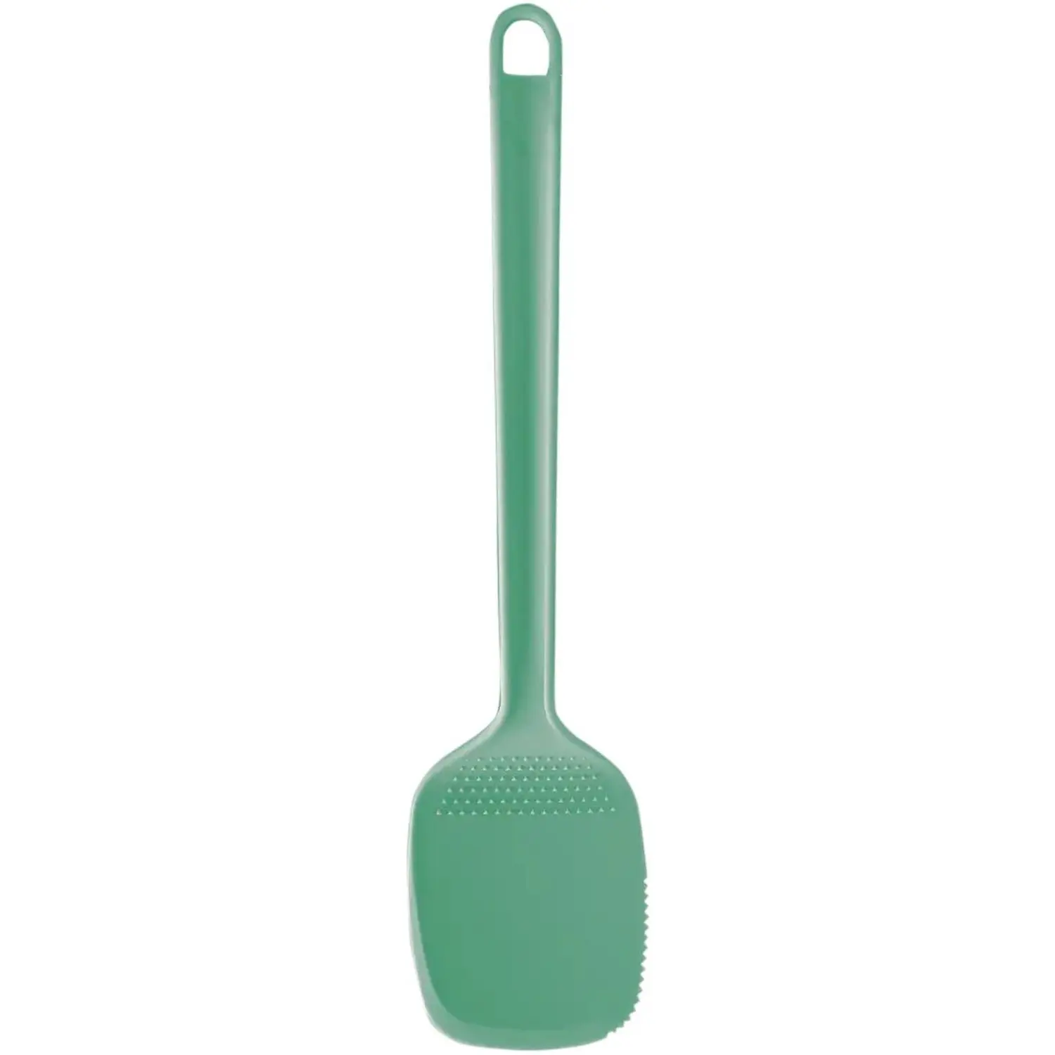 Рабочая поверхность лопатки выполнена из силикона, который абсолютно безвреден для здоровья, не вступает ни в какие реакции с продуктами питания, а также не оставляет царапин на посуде с антипригарным покрытием. Имеет удобную прозрачную ручку из нейлона.