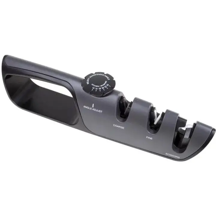 Точилка для ножів NS46SH/BK чорного кольору, призначена для заточування різних типів ножів, ножиць та інструменту. Виготовлена з міцного пластику. На нижній поверхні знаходяться гумові елементи для надійного контакту з поверхнею та стабільної фіксації в процесі використання. Має три секції для заточування, відповідно до розташування кромки леза. Регулятор дозволяє змінювати кут
