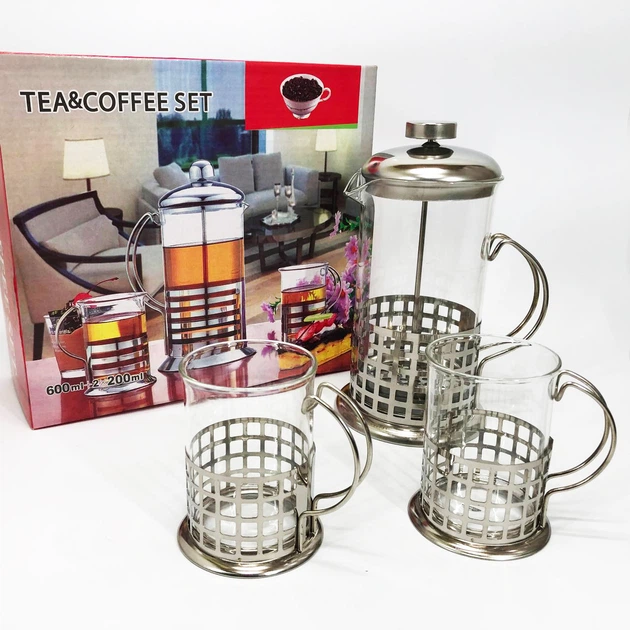 Прес-заварник із жароміцного боросилікатного скла unique un-1155 0.6 л + 2 чашки френч-прес для кави