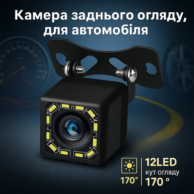 Камера заднього огляду, для автомобіля, з підсвічуванням 12LED, водостійка, кут огляду 120°, чорна