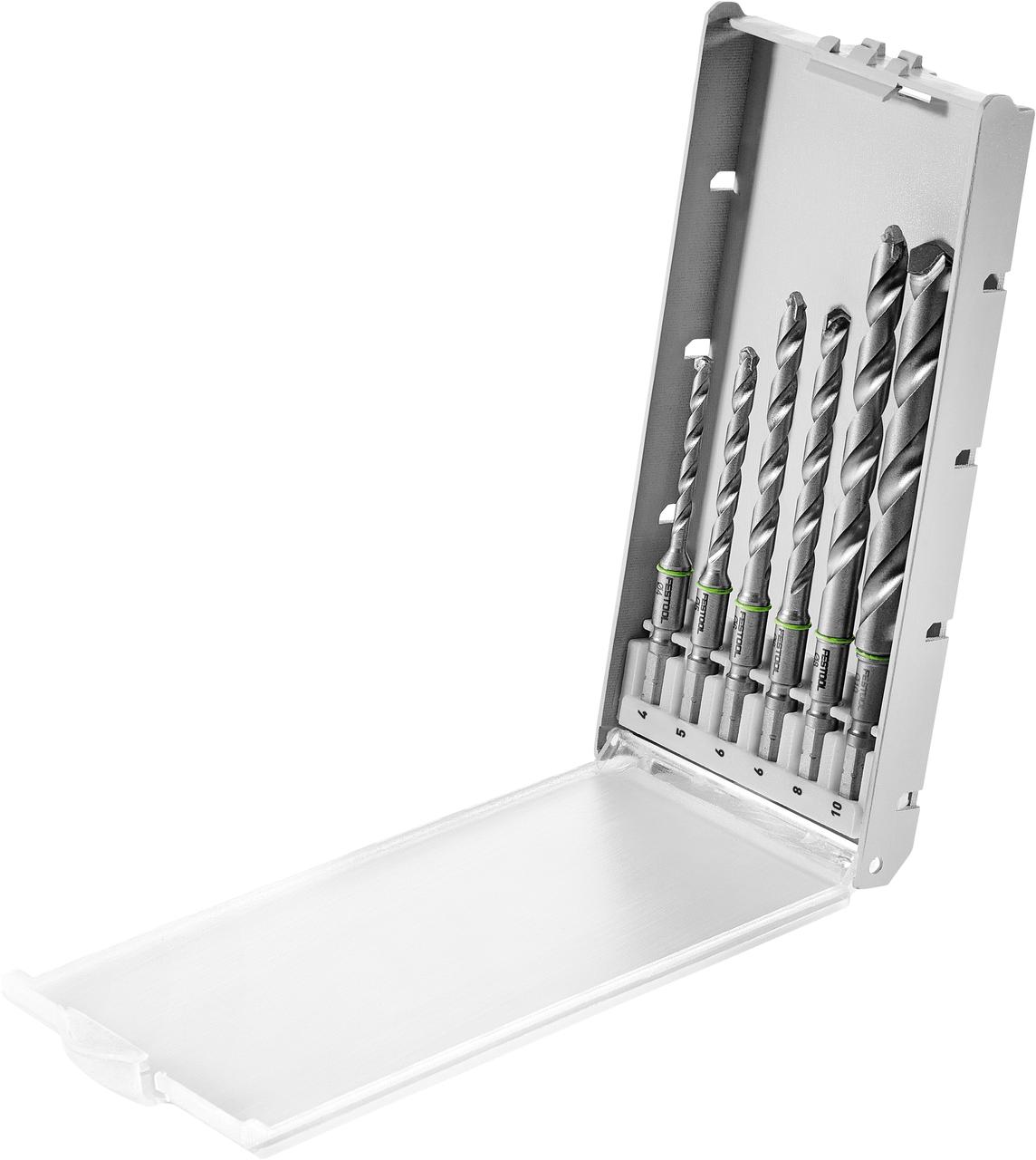 Набір свердел по каменю в касеті BKS SYS3 D4-10 CE/S Festool 577397 ПІДХОДИТЬ ДЛЯ НАСТУПНИХ ІНСТРУМЕНТІВ: для будь-яких акумуляторних дрилів-шуруповертів ТЕХНІЧНІ ДАНІ: Діаметр свердла, мм: 4, 5, 6, 8, 10 Довжина свердла, мм: 80 (Ø4) 85 (Ø5) / 100 (Ø6) / 120 (Ø8) / 120 (Ø10) Довжина спіралі свердла, мм: 40 (Ø4) / 50 (5) (5) (60) (6) (8) (8) (8) (8) (8) КОМПЛЕКТ ПОСТАЧАННЯ: свердло по каменю: діаметр 4 мм x довжина 80 мм: 1 шт. свердло по каменю: діаметр 5 мм x довжина 85 мм: 1 шт. свердло по каменю: діаметр 6 мм x довжина 100 мм: 2 шт. свердло по каменю: діаметр 8 мм x довжина 120 мм: 1 шт. свердло по каменю: діаметр 10 мм x довжина 120 мм: 1 шт. ПЕРЕВАГИ Зручно розміщується в систейнері з відсіком у кришці Свердла надійно утримуються в модулях, що зсуваються. Свердла з довговічними твердосплавними різальними крайками, що гарантують тривалий термін служби З хвостовиком CENTROTEC Для систейнерів³ з відсіком у кришці або як окремі бокси ЗАСТОСУВАННЯ І СПЕЦІАЛІЗАЦІЯ Для свердління у камені та цегляній кладці.
