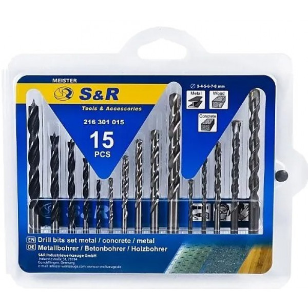Набір свердл S&R Meister 15шт.:3,4,5,6,8мм мет/дер/бетон (216301015) 216301015